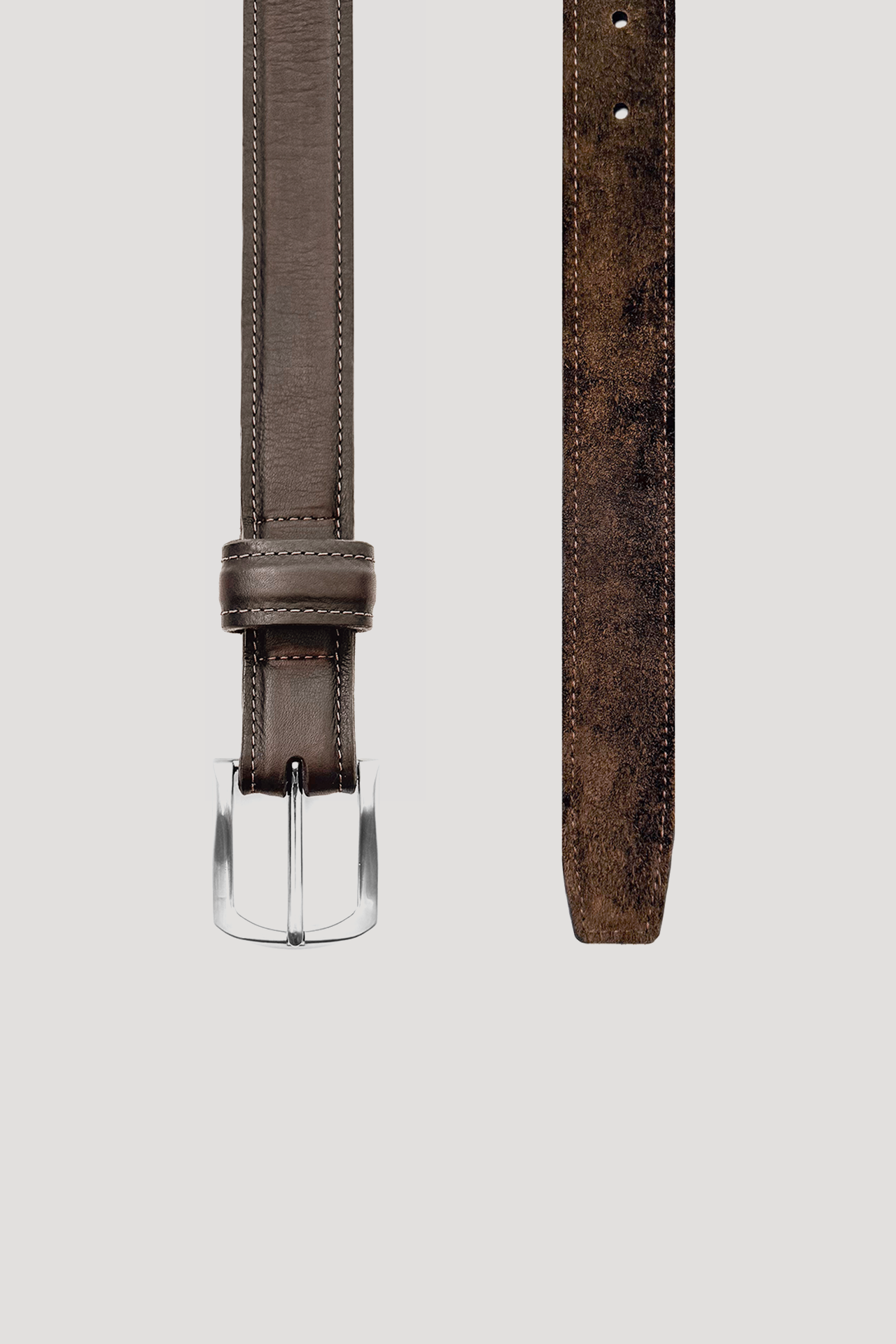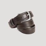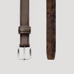 Italian mocha brown pull-up leather belt finished with soft suede. Cut, painted, and burnished by hand. Polished solid brass buckle with a mirror finish.