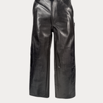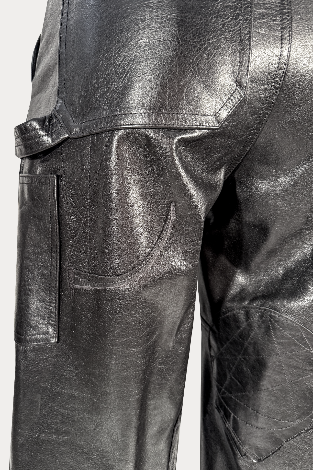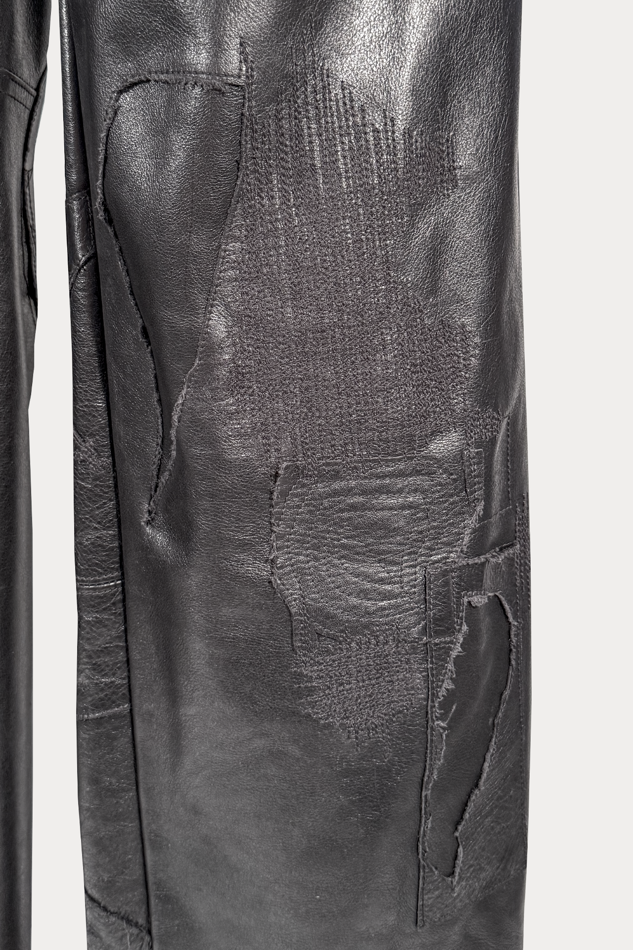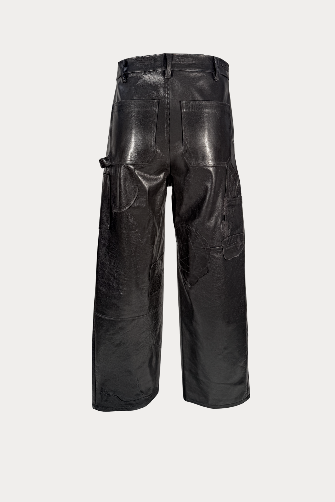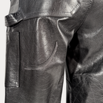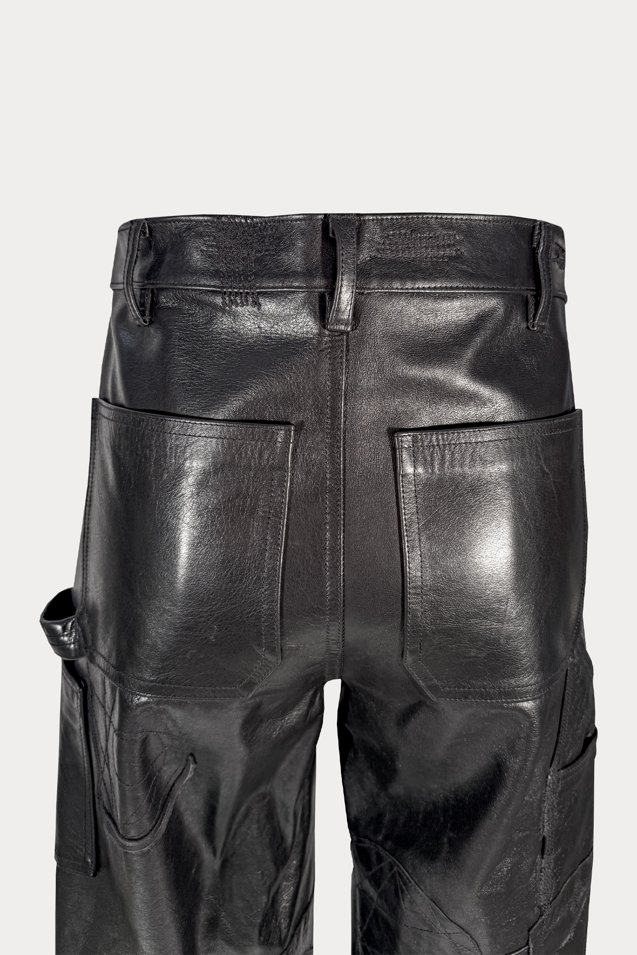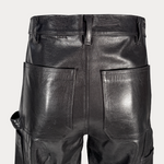 Black Italian cowskin carpenter leather pants with mending stitch details and patchwork. Suede lambskin pocketing and RiRi© zipper.
